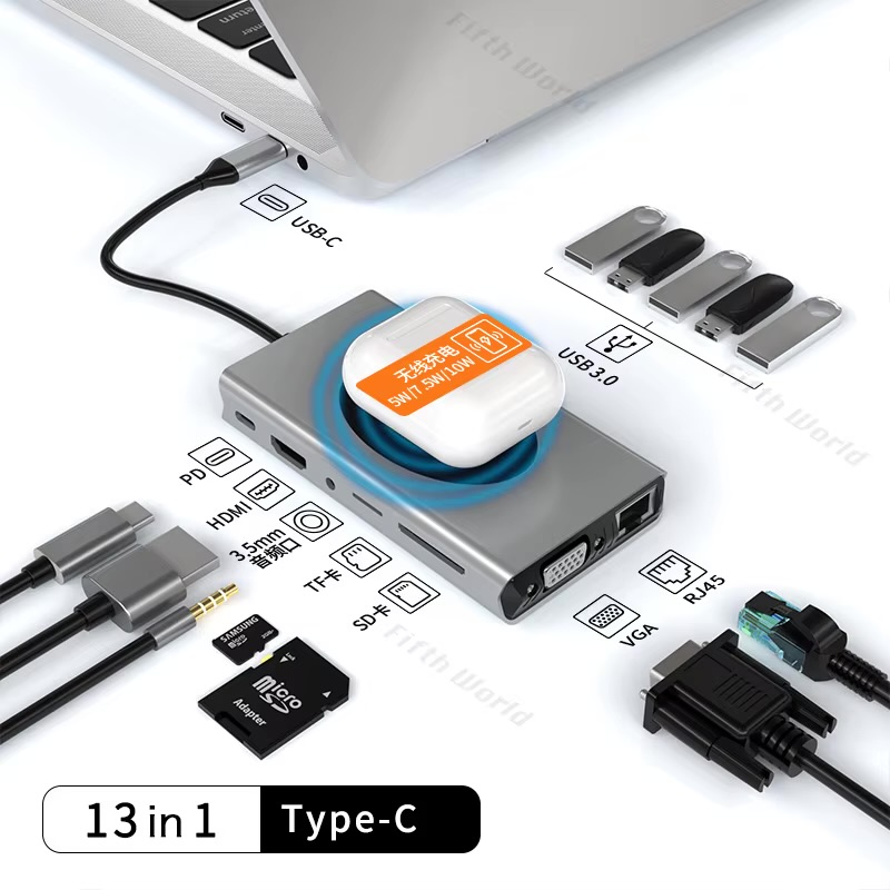 UD32, 12 In 1 Usb C To Hdmi+RJ45(100Mbps+2*Usb3.0+Usb2.0+2*Usb C+SD/TF Slot+3.5mm Audio+Pd, With Wireless Charging